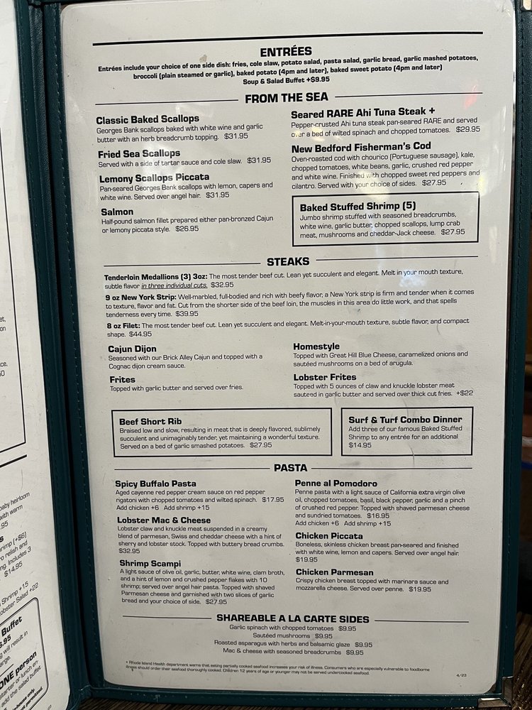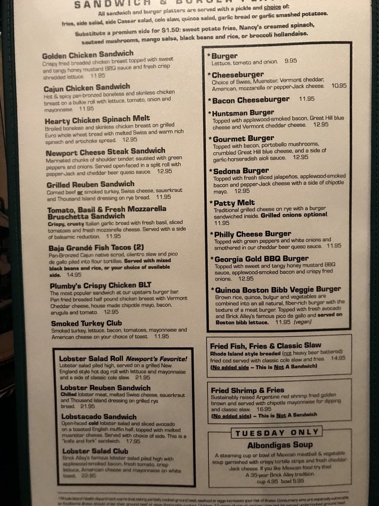 Brick Alley Pub & Restaurant, located on 140 Thames St in Newport, RI, is a bustling American pub offering a range of dining experiences. The menu features diverse options, such as lobster rolls, turkey clubs, spinach and artichoke dip, steak and stuffed shrimp, BBQ burgers, Portuguese littleneck soup, stuffed sole, and more. Customers rave about the succulent lobster rolls, delicious turkey clubs, and top-notch spinach and artichoke dip. The venue's vibrant atmosphere, retro decor, and attentive staff create a welcoming dining environment. With features like a full salad bar, private dining, and a variety of vegan and vegetarian options, Brick Alley Pub caters to a wide range of preferences. Whether you're a local or a tourist, this Newport staple is definitely worth a visit for a memorable dining experience.